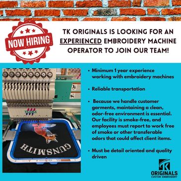 At TK Originals we believe every client deserves to have high quality, custom embroidered clothing that will withstand the test of time. From concept to thread, we are committed to helping you bring your vision to life. We will communicate with you throughout the entire process. Visit us today! No appointment is needed.